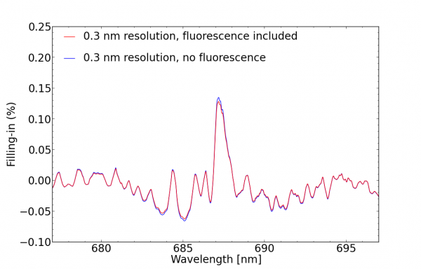 The convolution is carried out with the libradtran conv UVSPEC_FLUORESCENCE_650_880_noraman.OUT SLIT_0.3.dat > UVSPEC_FLUORESCENCE_650_880_noraman.OUTc_0.3 The TOA radiance for the full wavelength region covered by the O2-A and B bands,is shown in the Figure below at high, 0.01 nm (blue line), and FLORIS, 0.3 nm (magenta line), spectral resolution. The fluorescence spectrum, multiplied by a factor of 100, is shown in red while the surface albedo used for the simulation is shown by the green line. The radiance for the O2-B band with and without fluorescence is shown in the Figure below. Rotational Raman scattering was included in the spectra above. The filling-in with and without fluorescence is given below: Input filesThe various input and output files discussed above are available as a gzipped tar ball flex_example.tgz. 1)