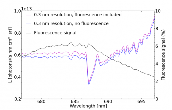 Table of ContentsFLuorescence EXplorerThe FLuorescence EXplorer (FLEX) mission is devoted to monitor the photosynthetic activity of the terrestrial vegetation layer1). The natural fluorescence signal is weak compared to the reflected solar radiation. However, by measuring at wavelengths where the solar spectrum is attenuated, for example the O2-A and B bands, information about natural fluorescence may be retrieved 2). The top of the atmosphere (TOA) radiance in the O2-A and B bands is influenced by the fluorescence magnitude, surface pressure, aerosol optical depth, aerosol layer height and aerosol type. Radiative transfer models may be used to quantify these effects. In this example we show how uvspec may be used to simulate the TOA radiance in the O2-A and B bands representative for the FLEX mission. It is also shown how rotational Raman scattering may be included in the simulation. Spectral resolutionThe key instrument for the FLEX mission is the FLuORescence Imaging Spectrometer (FLORIS). It is planned to measure at 0.3~nm spectral resolution. Thus radiative transfer simulations should be carried out at higher spectral resolution and convolved with an appropriate spectral response function. This requires a solar spectrum with high spectral resolution. Here we use a spectrum with 0.01 nm resolution3) The solar spectrum must have the same units as the fluorescence spectrum. We use units of photons/nm/s/m2 in order to be able to include rotational Raman scattering. The following uvspec option specifies the solar source: source solar ./UVSPEC_FLUORESCENCE_kurucz_640.0_810.0.dat_vac_0.01_0.01