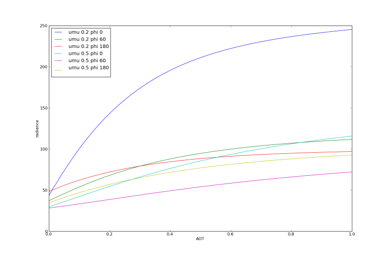 If your script ran without complaints check out the contents of the lookup table. It is named # AOT, umu 0.2 phi 0, umu 0.2 phi 60, umu 0.2 phi 180, umu 0.5 phi 0, umu 0.5 phi 60, umu 0.5 phi 180 0.000 4.355755615e+01 3.711856461e+01 4.831068802e+01 2.976097298e+01 2.829813576e+01 3.437047577e+01 0.001 4.413818741e+01 3.729845810e+01 4.845688248e+01 2.987973022e+01 2.834116173e+01 3.450103378e+01 0.002 4.474126053e+01 3.749518204e+01 4.862616730e+01 3.000129890e+01 2.839014435e+01 3.465411758e+01 ... There is a plotting script (requiring Python Matplotlib) provided in the example and called at the end of the Bash script. It plots the radiances as function of the variable parameter for the viewing directions specified in the template file. The AOT-dependence for the provided example is shown here: